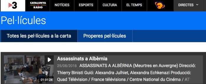 A la pàgina web de TV3 podem trobar-hi pel·lícules que s’han emès recentment a la carta; senceres, gratuïtes, legals, i en aquest cas, en català. Durant uns dies el canal disposa dels drets d’emissió per internet.