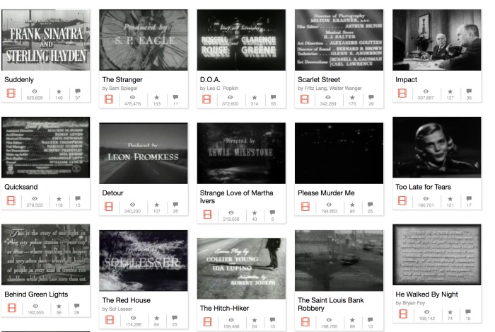 Un dels millors repositoris de cinema lliure de drets, ben catalogat i amb una quantitat de títols considerable és Archive.org. Aquesta videoteca digital és gestionada per una organització sense ànim de lucre. També podem trobar-hi de forma gratuïta: llibres, música,… L’arxiu audiovisual, a part d’altre material, hi ha més de 5.000 pel·lícules sense drets d’autor (a part, també s’hi poden trobar produccions més recents, finançades amb crowdfunding) A continuació tenim 3 exemples: 97 pel·lícules classificades com a Film Noir (cinema negre), 475 de Ciència-Ficció i 292 de Comèdia.