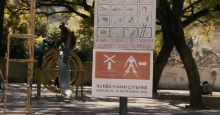 Recordem que l’Apartheid va ser una política d’Estat de segregació racial que va dur-se a terme entre 1948 i 1990 a Sud-àfrica. La legislació dividia els habitants en grups racials que es corresponien amb zones residencials segregades, reservant per als blancs els serveis de major qualitat. A District 9, l’espai actua com una esfera psicològica del relat.