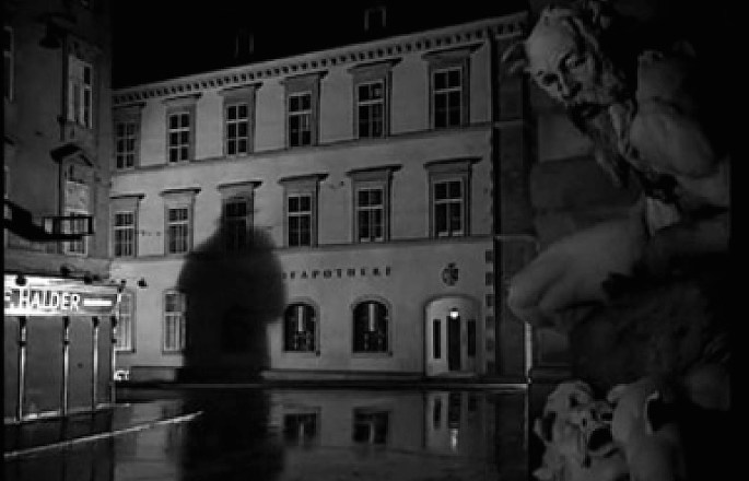 Martins se n’adona que l’estan seguint; uns plans ens mostren un home amagat a les fosques entre dues parets amb un gat blanc als peus. Un altre pla ens mostra una finestra (una finestra que anteriorment s’ha subratllat la seva importància) i com s’encén la llum de la casa que hi ha just a sobre del personatge. És en el següent pla on veiem com s’il.lumina el rostre d’en Lime.