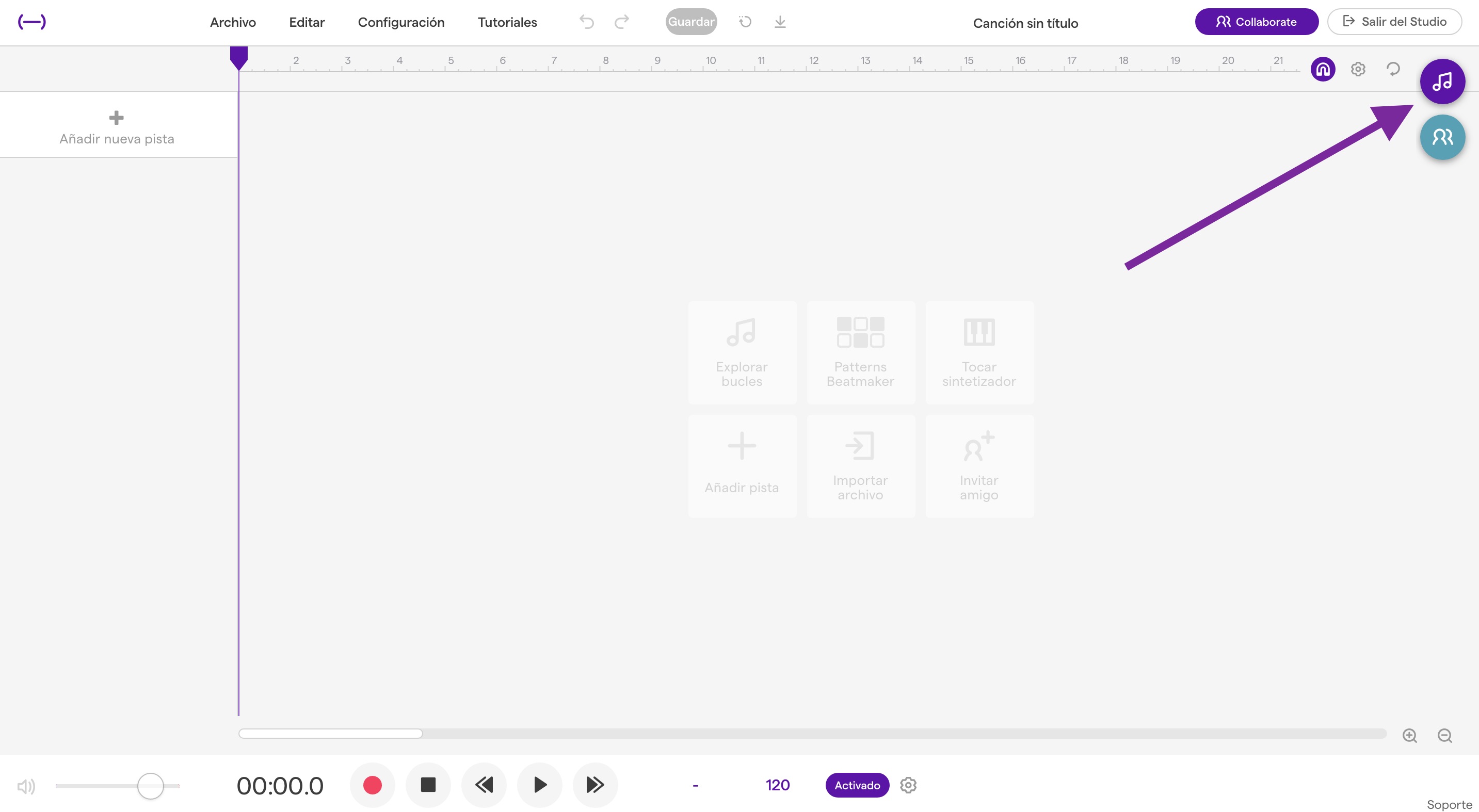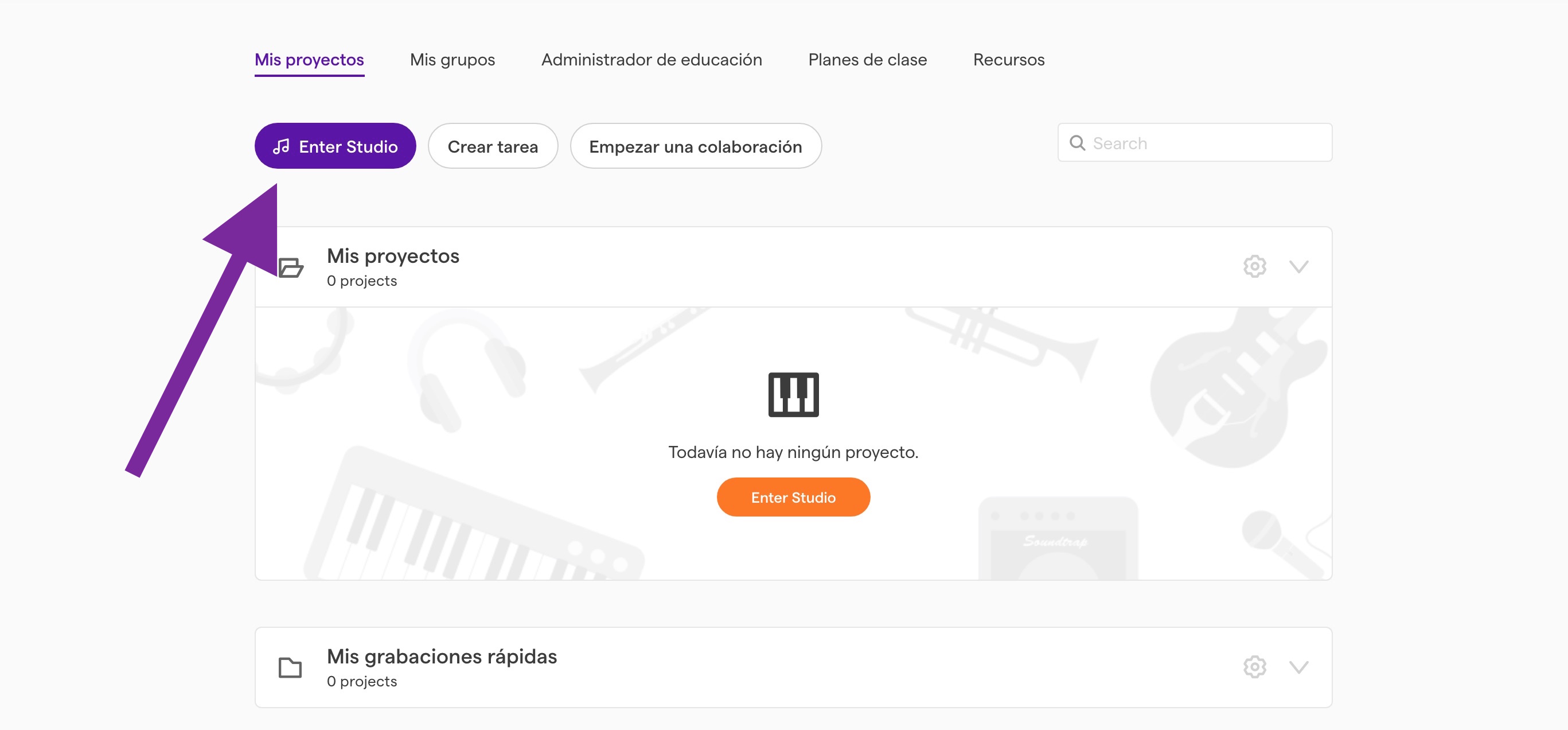 1. Per a la realització de la pràctica podeu utilitzar la composició creada a Soundtrap 1: iniciació; si és així, obriu de nou el projecte guardat. Si creem una nova composició, aneu a “Enter studio”: