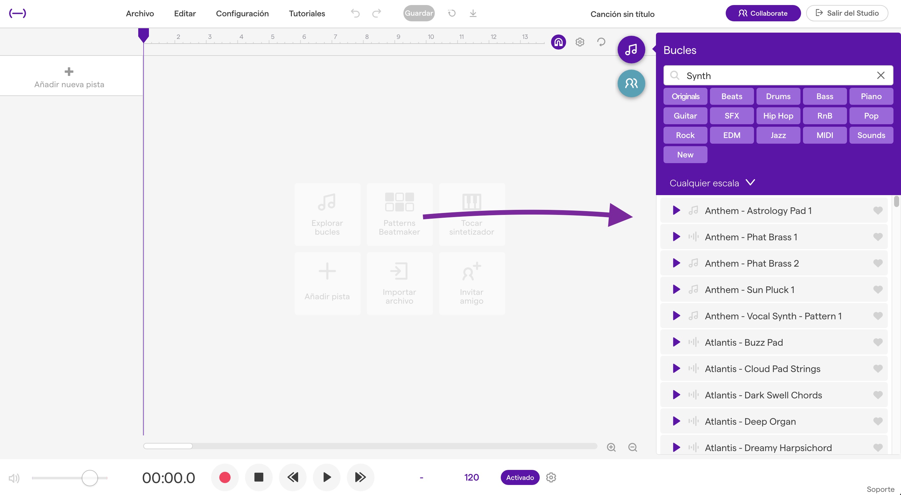 4. Feu clic a la icona de “bucles/loops” a la part superior dreta. Trieu un filtre d’instrument per al loop. Feu clic en un bucle una vegada per si voleu escoltar-lo. Seleccioneu un bucle i arrossegueu-lo al vostre projecte (o el sobre impressioneu a la peça ja creada en l’activitat 1). Afegiu més capes amb algun altre instrument. Per ampliar els bucles, moveu el cursor del ratolí a l’angle superior dret del bucle i arrossegueu. Recordeu que un bucle (en anglès: loop) és un o diversos compassos musicals que es graven o reprodueixen enllaçats en seqüència, repetint-se una vegada darrera l’altra.