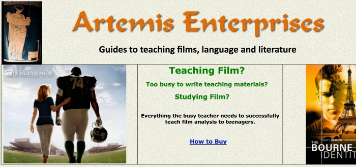 Artemis Enterprises ofereix materials didàctics relacionats amb centenars de pel·lícules. Podem treballar-hi bàsicament: Llengua i Literatura anglesa. L’inconvenient és que aquests materials són de pagament. Tanmateix, ofereix informació molt detallada dels continguts, tant de la guia del professor/a com del material de l’alumne. De cada proposta didàctica pot descarregar-se la portada i una pàgina de mostra dels continguts. Totes les guies apareixen en format A4 i preparades per a fotocopiar. Totes elles són propostes força treballades.
