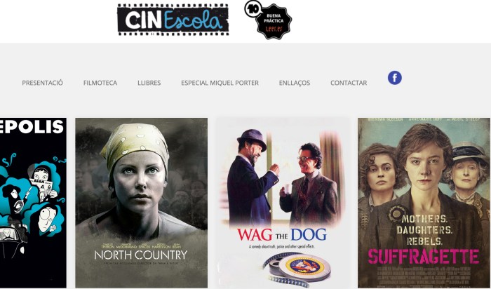 En aquesta web hi podreu trobar una selecció de pel·lícules seqüenciades a través de les diferents etapes educatives, des d’Educació Infantil fins a Educació de Persones Adultes, passant per Primària, Secundària, Batxillerat i Cicles Formatius. Cada pel·lícula disposa d’una fitxa tècnica i una proposta didàctica per treballar a l’aula. A part, la web també ofereix articles relacionats amb el món del cinema.