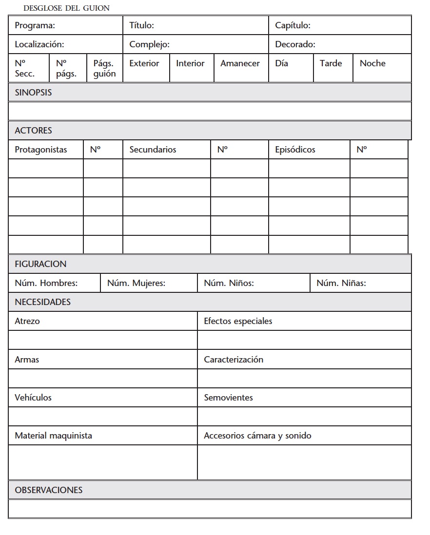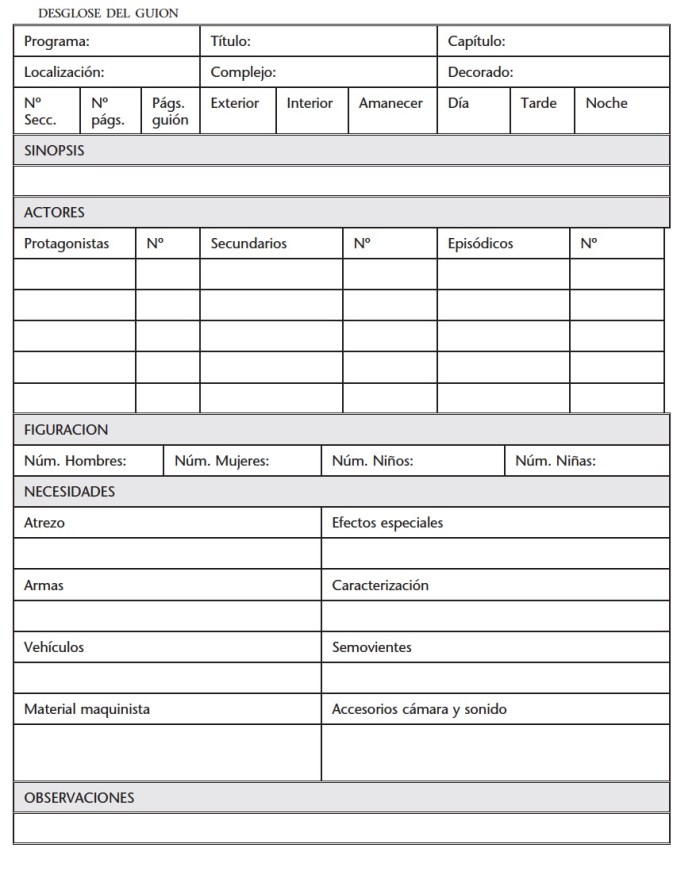 Feines molt costoses i característiques d’aquesta fase són els desglossaments del guió (llistats d’atrezzo, vestuari, etc) i el treball de les localitzacions. Pensem que només per les localitzacions, necessitarem fer tot un seguit de llargues gestions i tramitació de permisos. Escollir per a les seqüències localitzacions reals, tant d’exteriors com d’interiors, que atorguin versemblança al film/curtmetratge/sèrie i contribueixin a fer més viable econòmicament el projecte, no és pas una tasca fàcil. No cal dir que si hem de construir decorats, ho complicarem encara més, gairebé sempre és més car que fer servir localitzacions existents. Trobareu molts exemples de fitxes de localitzacions penjats a la xarxa. Tractarem algun altre aspecte del desglossament del guió en l’apartat 5.2